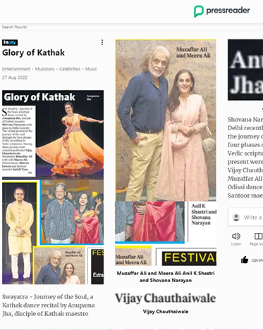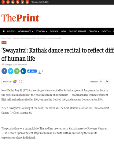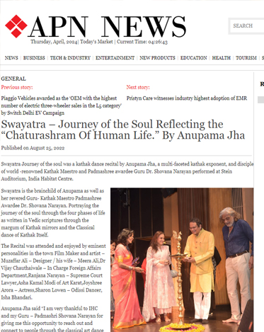 Another production that reflected the "Chaturashram human Life," under the guidance, choreography, and teachings of her esteemed Guru Padmashri Shovana Narayan , was brought to life in a prestigious partnership with IHC (India Habitat Center), New Delhi . This collaboration gained immense success and garnered huge adulations from art fraternity and connoisseurs across Delhi. The Production Swayatra portrayed the soul's journey through the four phases of life as written in Vedic scriptures through the margin of Kathak mirrors and the Classical dance of Kathak itself. Swayatra is the brainchild of Dr. Shovana Narayan and Anupama.