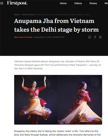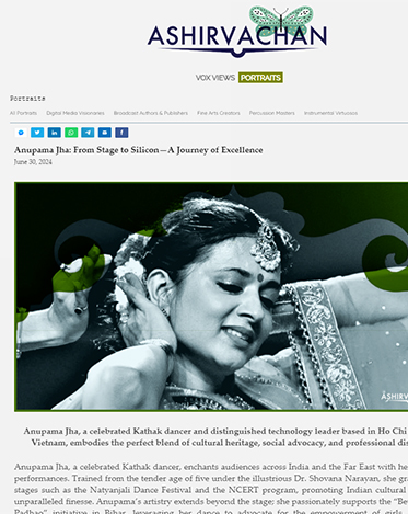 Anupama is a dedicated devotee and performer of Kathak, whose passionate performances have captivated audiences across India and the Far East. Her unwavering dedication to Kathak is evident in her compelling stage presence and her performances, which are notable for their clarity of movements and dazzling pirouettes. She is a devout follower and disciple of the renowned Kathak Maestro and Padma Shri awardee Guru Dr. Shovana Narayan, to whom she attributes all her achievements, along with her parents, especially her father, Anupama's journey into Kathak began at the tender age of five, when especially her father, Dr.Naresh Jha, introduced her to this captivating art form. Since then, they have been her guiding light, source of inspiration, and pillar of strength.