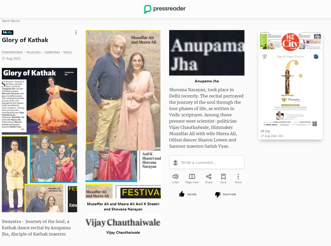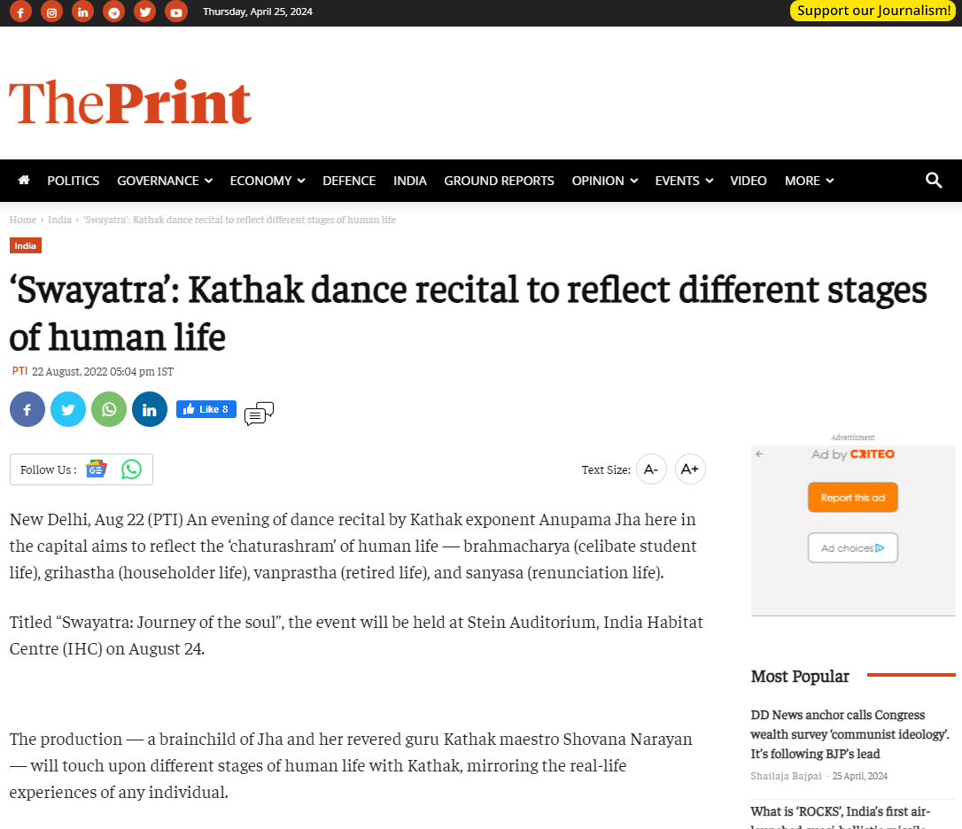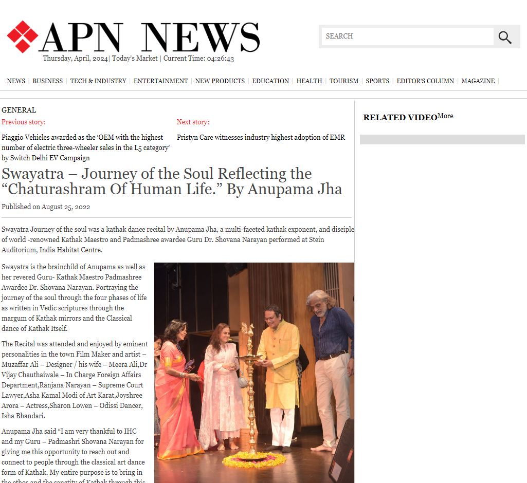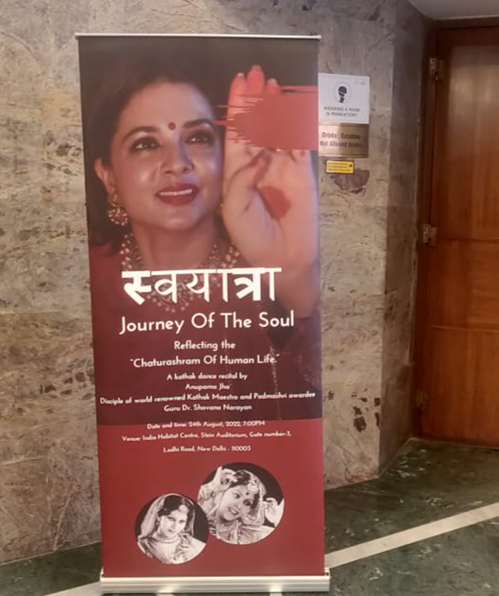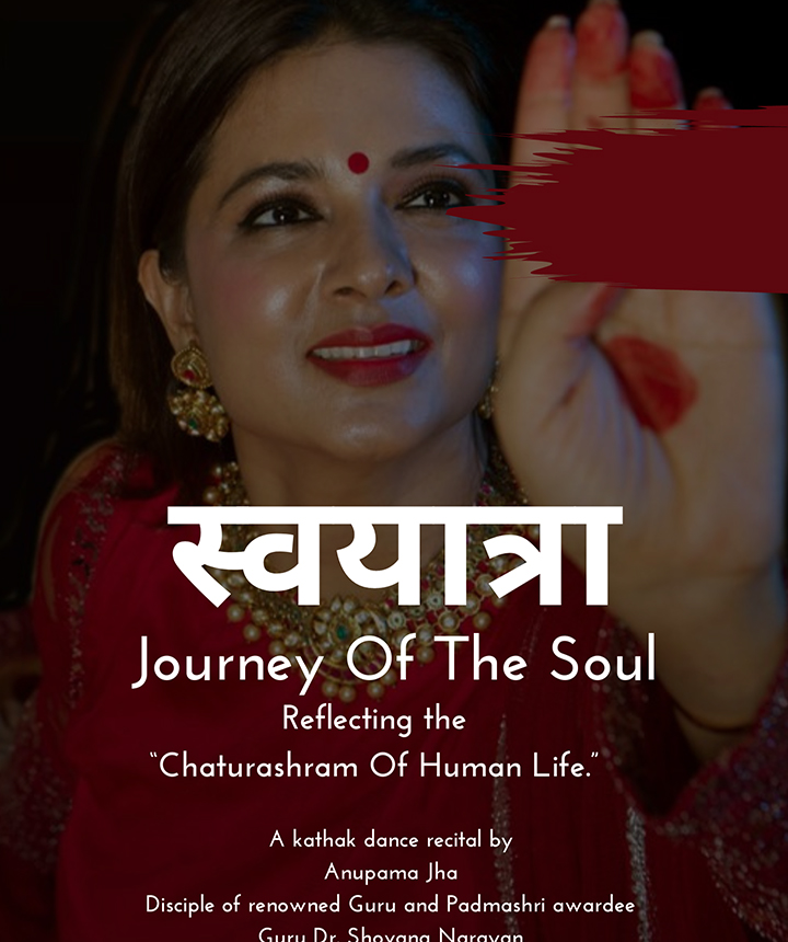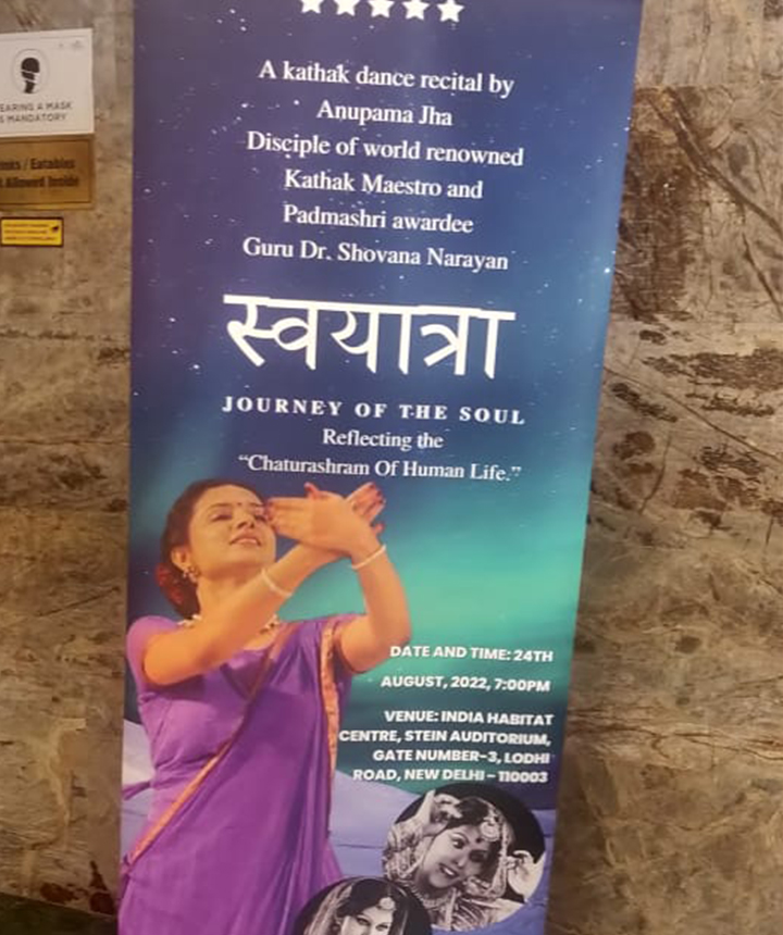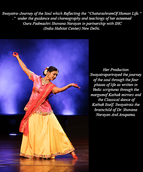 Another production that reflected the "Chaturashram human Life," under the guidance, choreography, and teachings of her esteemed Guru Padmashri Shovana Narayan , was brought to life in a prestigious partnership with IHC (India Habitat Center), New Delhi . This collaboration gained immense success and garnered huge adulations from art fraternity and connoisseurs across Delhi. The Production Swayatra portrayed the soul's journey through the four phases of life as written in Vedic scriptures through the margin of Kathak mirrors and the Classical dance of Kathak itself. Swayatra is the brainchild of Dr. Shovana Narayan and Anupama.