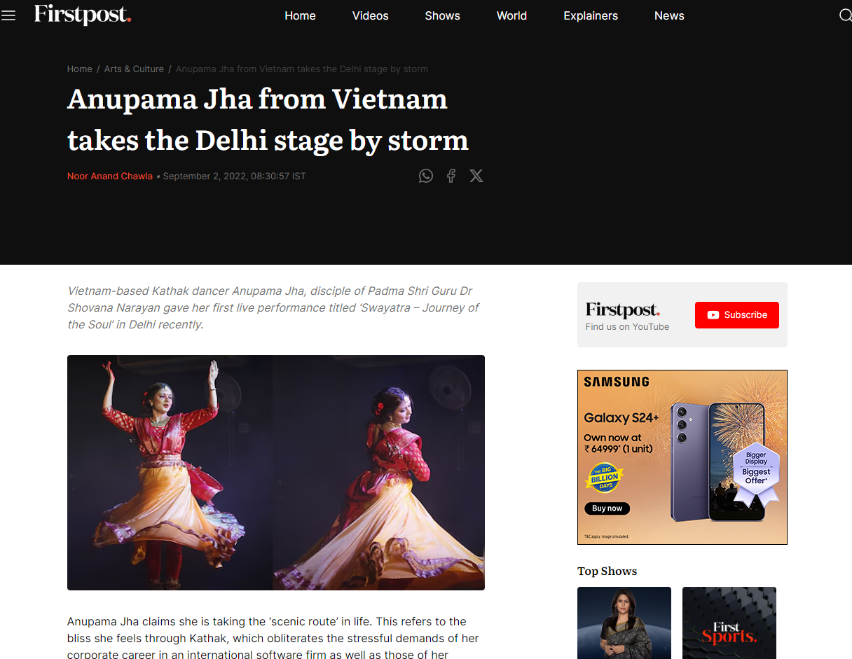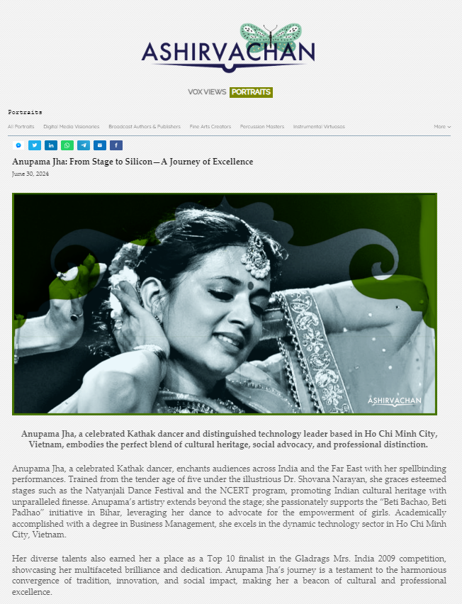 Anupama is a dedicated devotee and performer of Kathak, whose passionate performances have captivated audiences across India and the Far East. Her unwavering dedication to Kathak is evident in her compelling stage presence and her performances, which are notable for their clarity of movements and dazzling pirouettes. She is a devout follower and disciple of the renowned Kathak Maestro and Padma Shri awardee Guru Dr. Shovana Narayan, to whom she attributes all her achievements, along with her parents, especially her father, Anupama's journey into Kathak began at the tender age of five, when especially her father, Dr.Naresh Jha, introduced her to this captivating art form. Since then, they have been her guiding light, source of inspiration, and pillar of strength.